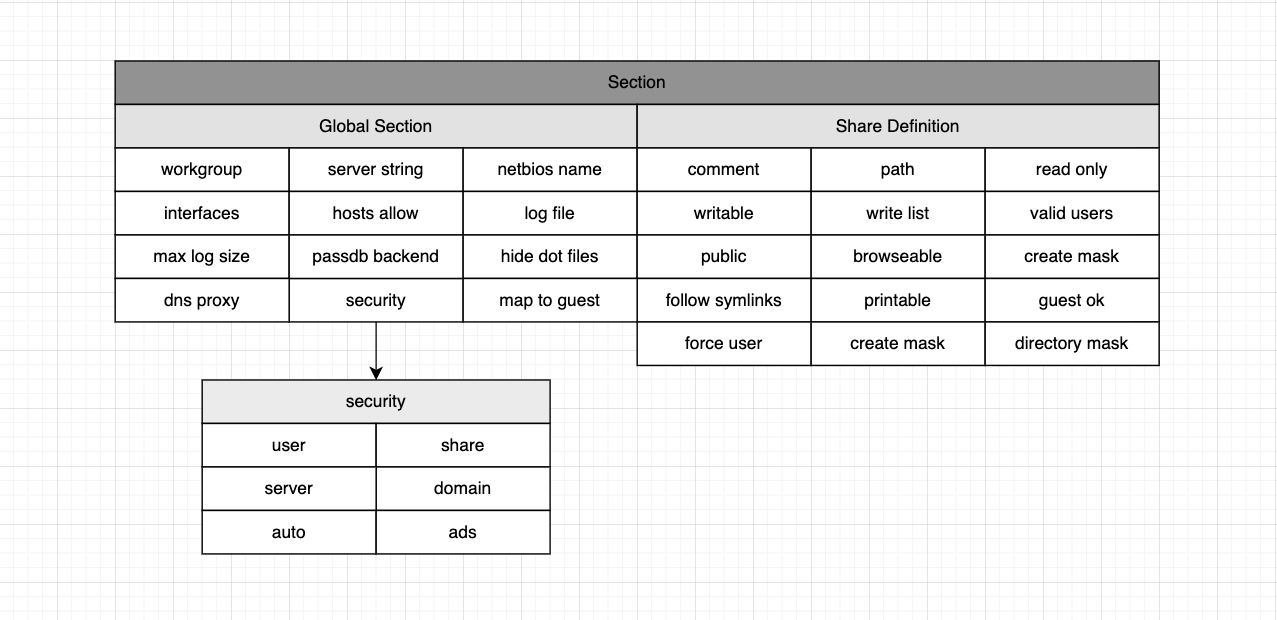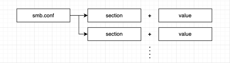 smb.conf 내부에는 각 섹션에 대해서 설정 가능한 항목에 대해 어떤 값이 설정 되어있는지 작성되어 있다.