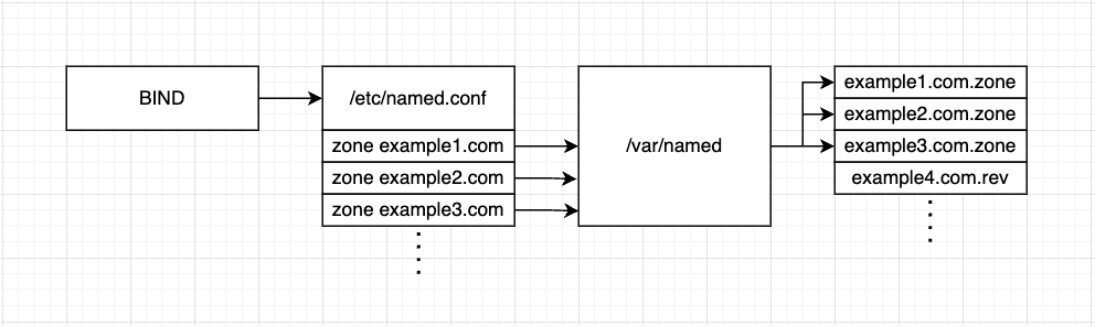 bind가 구동이 되면 /etc/named.conf 파일을 로드하고 필요한 zone 파일들을 확인한다. 이후 /var/named 하위의 필요한 zone 파일들을 로드하여 메모리에 적재한다. 이때 conf 파일과 zone 파일에 정의된 규칙대로 DNS 서비스를 진행한다.