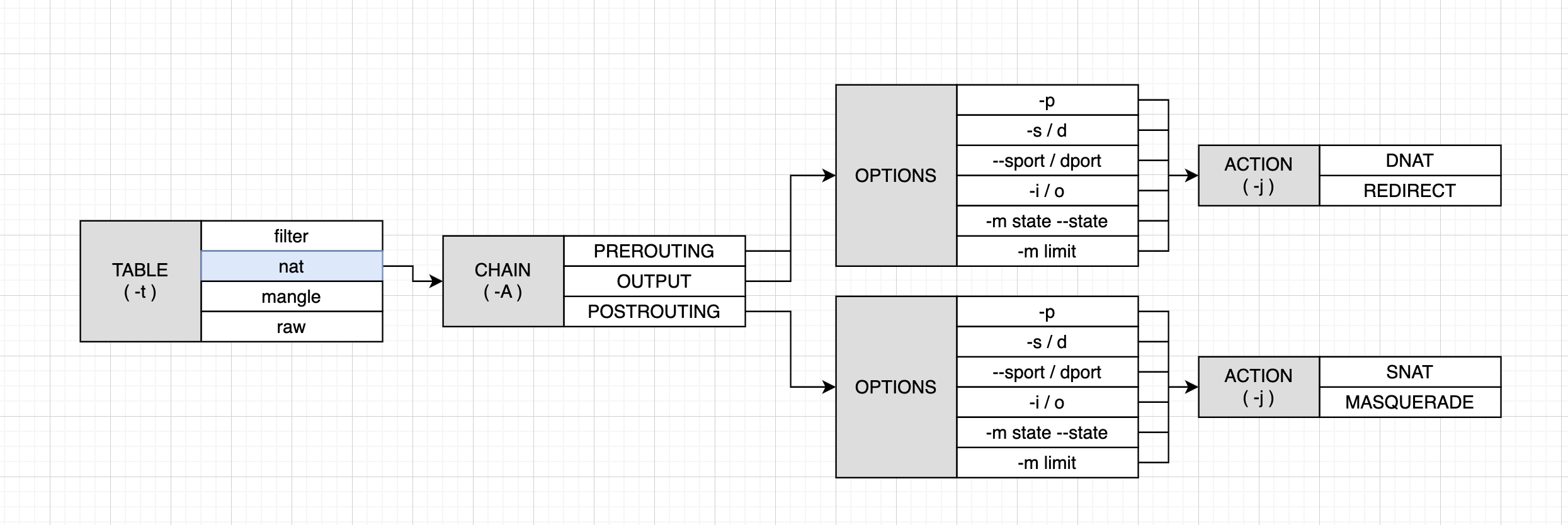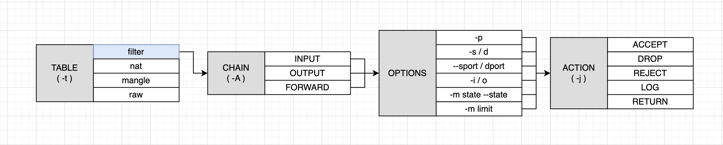 iptables에서 가장 기본적이고 많이 쓰는 테이블로, 주로 패킷의 허용/차단을 담당한다. filter Table을 사용하기에 -t filter를 작성하고 그 이후 원하는 체인(상황), 원하는 옵션(조건)들, 마지막으로 해당 옵션이 성립할 때 행할 action을 선택해주면 된다.