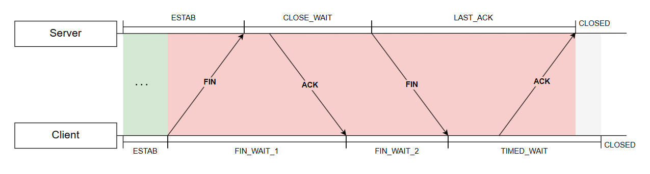 FIN은 FINAL를 의미한다. 연결 유지 상태인 ESTAB(Established) 상태인 클라이언트가 서버에 요청을 중단하고자 FIN을 보낸다. 이 때, 클라이언트는 FIN에 대한 응답을 기다리는 FIN_WAIT_1 상태에 들어간다. FIN 요청을 받은 서버는 CLOSE_WAIT 상태에 들어가고 클라이언트에게 FIN에 대한 ACK를 보낸다. ACK를 받은 클라이언트는 서버의 FIN을 대기하는 상태인 FIN_WAIT_2에 들어가게 된다. 이렇게 다시 한번 서버의 FIN을 기다리는 이유는 서버가 필요한 데이터 전송이 끝나지 않았을 수 있기 때문에 클라이언트는 확실하게 서버의 FIN 요청을 대기하게 된다. 서버는 FIN 요청을 클라이언트에게 보내고 마지막 ACK를 기다리는 LAST_ACK 상태에 들어간다. 서버에게 FIN 요청을 받은 클라이언트는 CLOSED 상태에 돌입하기 위한 타이머를 동작시키고 서버에게 ACK를 보낸다. ACK를 받은 서버는 즉시 CLOSED 상태에 들어가게 된다. 하지만, 클라이언트는 기존에 설정해두었던 타이머가 종료되어야 비로소 CLOSED 상태에 들어가게 된다.
