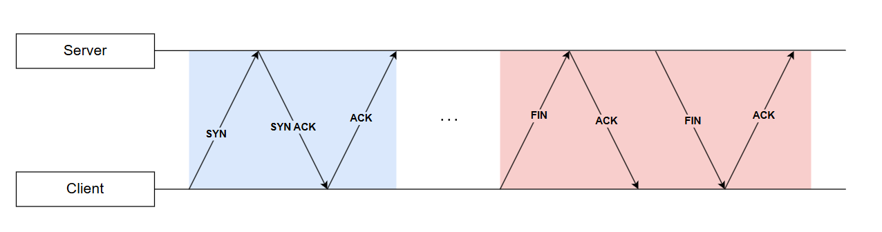 위 그림과 같이 SYN > SYN ACK > ACK로 연결을 유지시킨다. 이후 원하는 정보를 요청하고 응답하여 정보를 주고 받고 FIN > ACK > FIN > ACK를 통해서 연결을 해제한다. 각 handshake 기법에 대해서는 아래에서 다뤄보자.