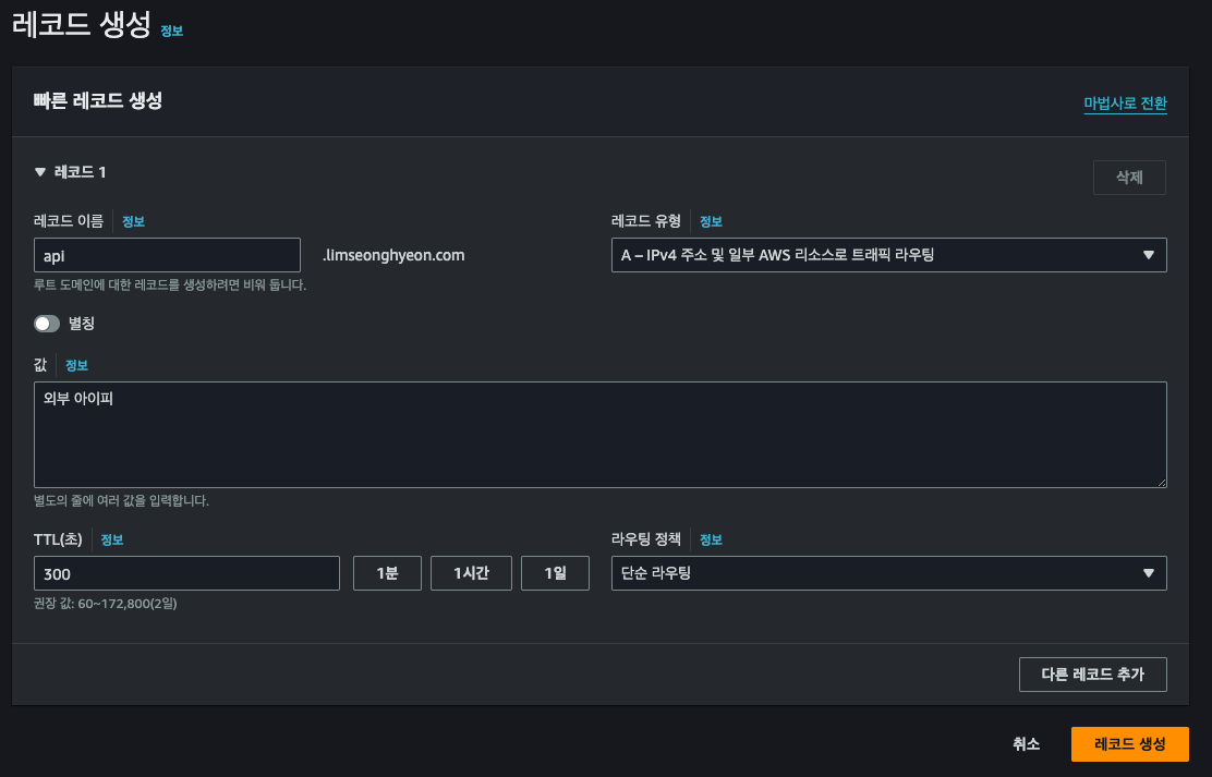 레코드 이름과 값에 외부 아이피를 설정하고 레코드를 생성하면 된다.