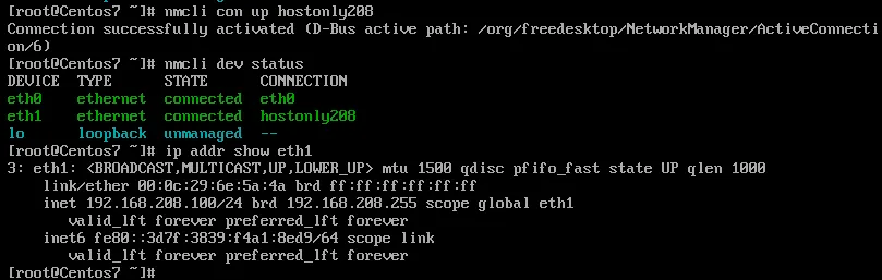 $ nmcli con up hostonly208